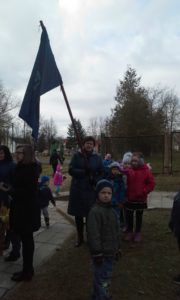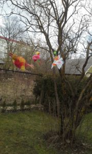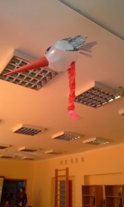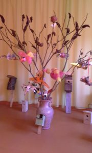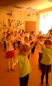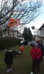Džiaugėsi vaikai ir grįžusiais paukšteliais. Salėje aidėjo paukščių balsų pamėgdžiojimai.  Mokyklos kieme į medelius  sutūpė paukščiai, pagaminti iš antrinių žaliavų.