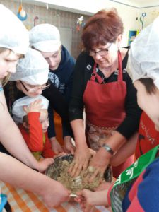 Emilio mama pademonstravo mokiniams duonos užmaišymo eigą ir tešla buvo padėta kildinimui.