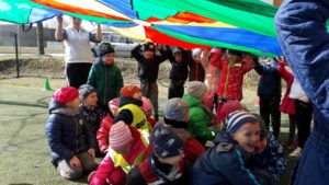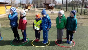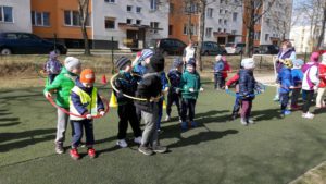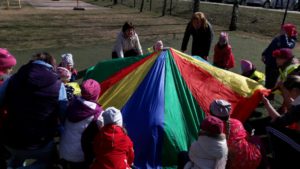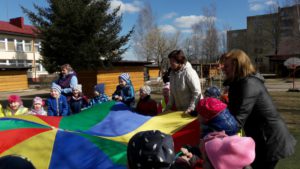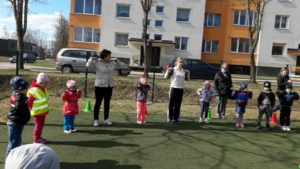 Kartu atlikome linksmąją mankštelę ,,Mankšta parkelyje‘‘, paskui žaidėme judriuosius žaidimus ,,Nameliai‘‘, ,,Automobiliai‘‘, estafetes ,,Dovanos kačiukams ir šuniukams‘‘ bei ramų žaidimą ,,Parašiutas‘‘. Pasportavę vaišinomės pyragu su arbata, dalinomės įspūdžiais, kūrėme planus ateinantiems susitikimams.