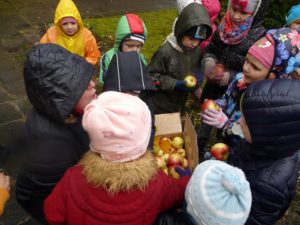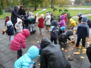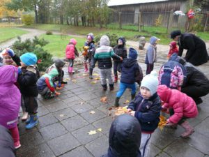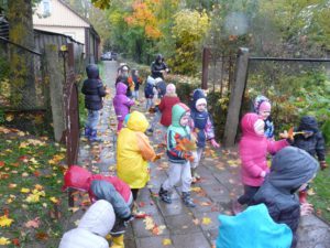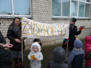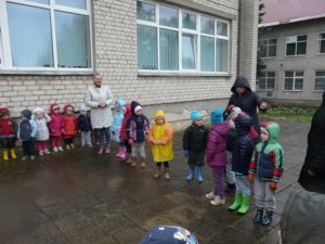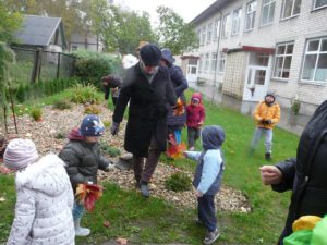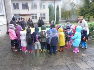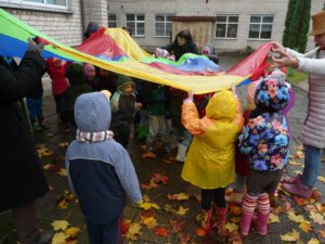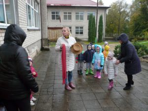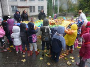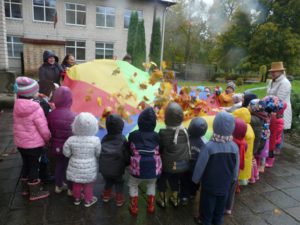 Lengvai dulkiant rudeniniam lietučiui, ikimokyklinių grupių vaikučiai su auklėtojomis sugužėjo į mokyklos kiemą.Taip prasidėjo jau tradiciniu tapęs renginys ,,Žaismadienis‘‘. Auklėtoja Daiva kvietė žaisti netradicinį žaidimą su skrybėle, šaliku ir pirštinėmis. Vaikai skubėjo pasirinkti įvairiaspalvių medžių lapų ir kartu su auklėtoja Rita žaisti su parašiutu. O auklėtoja Roma nustebino vaikus pakviesdama ieškoti paslėpto lobio – obuolių. Džiugias ,,Žaismadienio‘‘akimirkas užfiksavo auklėtoja Laima. Blogo oro nėra, jei tik yra tinkama apranga ir gera nuotaika.