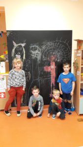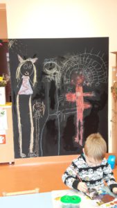 Džiaugiamės, kad ,, Kodėlčiukų‘‘ grupėje įrengta edukacinė erdvė vaikų kūrybiškumo ugdymui – sudaryta galimybė piešti ant sienos.