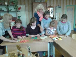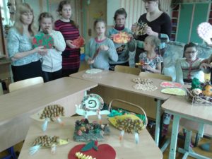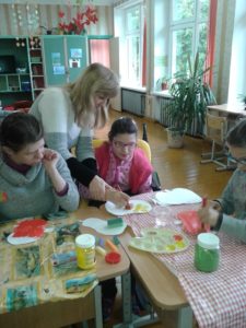 1-8 lavinamųjų klasių mokiniai padedami specialiųjų pedagogių Nijolės Zabulės, Loretos Madeikienės, auklėtojų Gelminos Mudrauskienės, Nijolės Krasovskajos ir auklėtojos padėjėjos Ritos Samuilovienės spalio mėnesį piešė, štampavo, aplikavo obuoliukus. Panaudojome įvairias gamtines ir buitines medžiagas: pupeles, žirnius, riešuto kevalus, kruopas, akmenėlius, kempinėles, siūlus, vatą, sagas, butelių kamštelius, glamžyto popieriaus gniužuliukus.