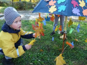 Visiems ,,Drugelių“ grupės vaikučiams labai patiko rudens skėčio puošimas įvairiaspalviais lapais, kurių mūsų mokyklos kieme išskirtinai daug.