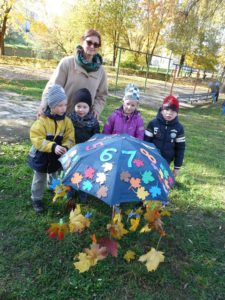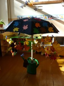 Su specialiąja pedagoge Edita Kareiviene paruošėme reikiamas priemones – skėtį, segtukus, skaičiukus. Lauke pasidžiaugėme gražuoliais klevo lapais ir kiekvienas susiradome gražiausiąjį. Skaičiavome, segėme, keitėme, kol mūsų skėtis apsirėdė aukso spalvomis. Ilgai dirbome, tačiau rezultatas patiko ir nustebino.