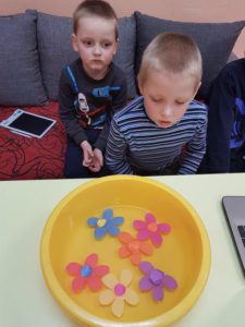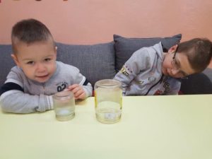 Sugalvojame ir atliekame įvairiausius eksperimentus – stebime, kaip įvairiaspalvėmis mozaikomis nusidažo vanduo į dubenėlį įdėjus spalvotus saldainukus, aiškinamės ir samprotaujame, dėl ko stiklainiuku uždengta žvakutė neužilgo užgęsta, džiaugiamės, kaip vandenyje tuoj pat ima skleistis sulankstytos popierinės gėlės, stebuklingai atskiriame maltus pipirus, sumaišytus su druska.