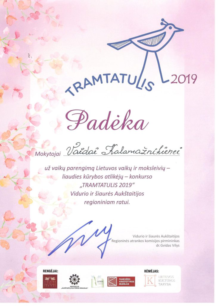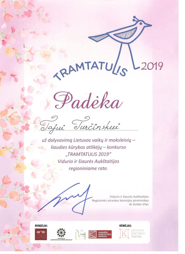Sveikiname mūsų mažąjį artistą Tajų Turčinską (mokytoja Vaida Kalamažnikienė), dalyvavusį Lietuvos ir moksleivių – liaudies kūrybos atlikėjų – konkurso TRAMTATULIS 2019 Vidurio ir Šiaurės Aukštaitijos regioniniame rate Panevėžyje!