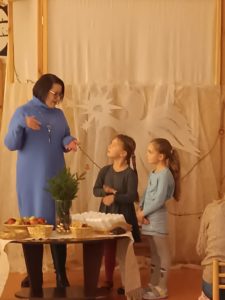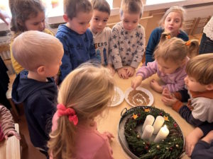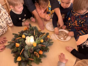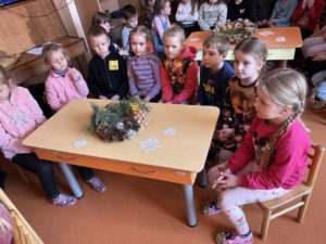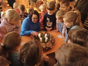 Adventas – gražiausias, paslaptingiausias ir prasmingiausias prieškalėdinis laikotarpis. Laukdami gražiausių metų švenčių, per kūrybinį darbą visa mokyklos bendruomenė pajautė Kalėdų laukimo džiaugsmą, pasitikėjimą savimi, patyrė daug nuostabių akimirkų. Advento vainiką pynė visų grupių, nuo mažiausiųjų iki vyriausiųjų, įstaigos vaikai. Šventė prasidėjo šešėlių teatro spektakliu „Jėzaus gimimo istorija“, kurį vaidino mokyklos grupių mokytojai. Įstaigos direktorė kartu su pavaduotoja uždegė kiekvienam vainikui po žvakę. Jaukią šventę papildė sekamos pasakos, minamos mįslės, advento giesmelės, liaudiški žaidimai. Dalyvaudami renginyje ugdytiniai įgijo žinių apie advento laikotarpio papročius ir tradicijas, praplečiant pažinimo ir komunikavimo kompetencijas.