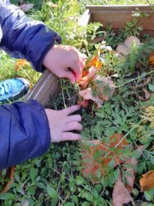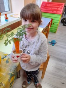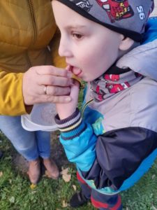 Visai netikėtai sužinojome, kad įdėjus ir palaikius vandenyje kankorėžius, jie sumažės, susitrauks, paliks glotnūs ir švelnūs, ragaudami išbandėme įvairių daržovių ir vaisių skonį, ,,pasisodinome” morkas, suradome lysvėje besirpstančią braškę, tęstinių veiklų metu išmėginome tapymą ant sausos medžio šakos, vėliau papuošėme ją nuostabiais pačių surinktais klevo lapais, iš kurių dar pasigaminome užuolaidas ir pasipuošėme langus.