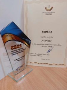 Džiaugiamės ir didžiuojamės, kad mūsų įstaiga buvo pastebėta, įvertinta ir apdovanota už aktyvų mokyklos bendruomenės įsitraukimą į sportines veiklas.
