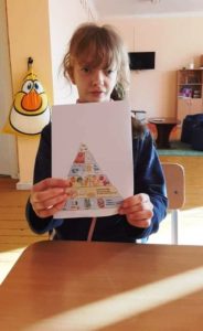 Mityba – viena iš pagrindinių gyvensenos veiksnių, turinčių įtakos vaiko sveikatai. Todėl vasario mėnesį ypatingą dėmesį skyrėme sveikai mitybai. Visuomenės sveikatos priežiūros specialistė Daiva Valienė pakvietė 5-10 lavinamųjų klasių mokinius per Zoom platformą aptarti sveikos mitybos principus, patarė kaip ugdytis tinkamus mitybos įpročius. Veiklos metu grupės vaikai analizavo „Sveikos mitybos piramidę“ bei dalijosi savo patirtimi, ką mėgsta valgyti namuose. Aptarėme kas sveika ir kas nelabai. Vaikams buvo paaiškinta, kad piramidės pagrindas – tai tarytum namo pamatas. Tai pati stipriausia dalis, nes ji turi išlaikyti visą namą. Išdiskutavome, kad maisto produktų, kurie yra piramidės papėdėje, reikia valgyti daugiausia. Kylant į piramidės viršūnę kiekvieno aukšto produktų reikia valgyti vis mažiau. Pabandėme patys kurti savo sveiko maisto piramides.