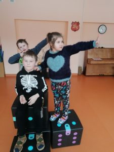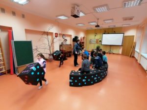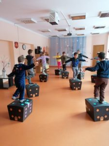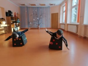 Mažais žingsneliais bandome naują priemonę – tai interaktyvūs kubai iMO –LEARN. Kubų pagalba išbandomas visiškai naujas mokymosi būdas, jis sukurtas taip, kad gali tarnauti kaip mokyklinis baldas lanksčiai mokymosi aplinkai sukurti. Dėl lengvos kubų konstrukcijos galima kūrybiškai modifikuoti vaikų grupės sėdėjimo išdėstymą. Sėdėdami ant jų vaikai daugiau juda ir taisyklingiau sėdi. Ugdomojoje veikloje ,,Kodėlčiukai“ išbando naujus mokomuosius pažintinius žaidimus, pvz: ,,Pažink savo kūną“, ,,Saugokis medžiotojo“, ,,Lenktynės“ ir kitus.