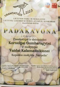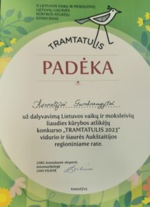 Kovo 1 d. Kupiškio kultūros centro vitražų salėje, 18-tą kartą vyko vaikų ir moksleivių – lietuvių liaudies kūrybos atlikėjų – konkursas „Tramtatulis 2023“. Šiemet konkurse dalyvavo „Angeliukų“ grupės auklėtinė Kornelija Gumbaragytė. Sveikiname Korneliją, tapus rajoninio rato laureate.