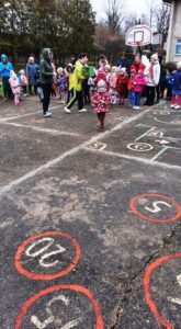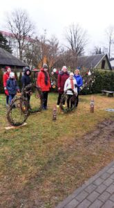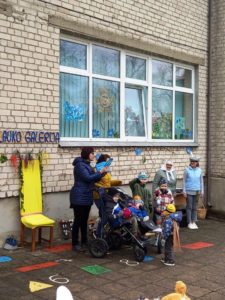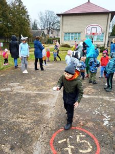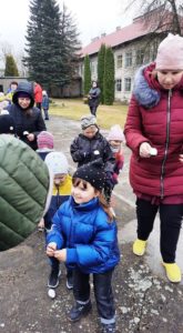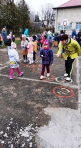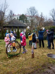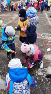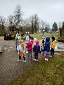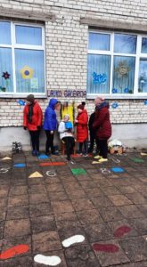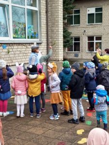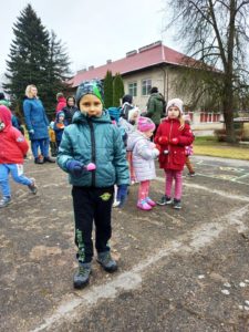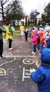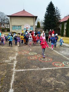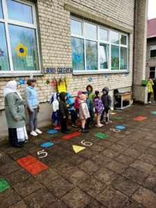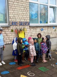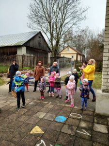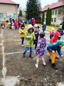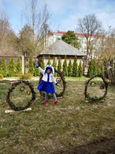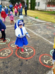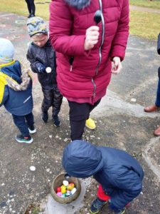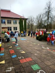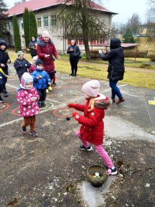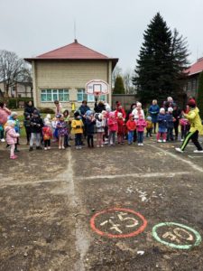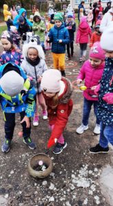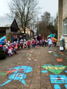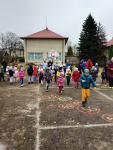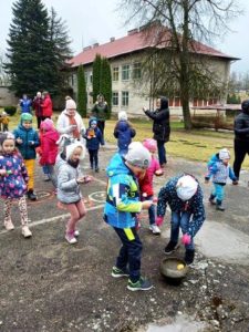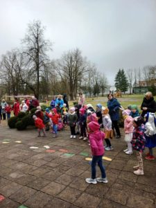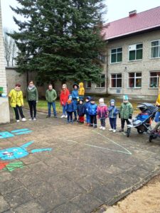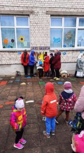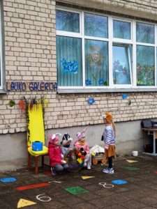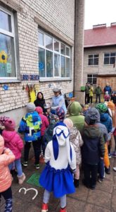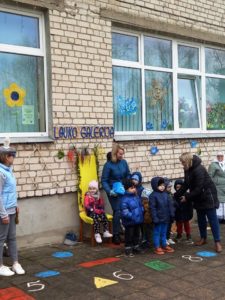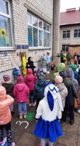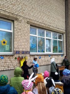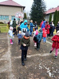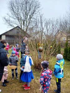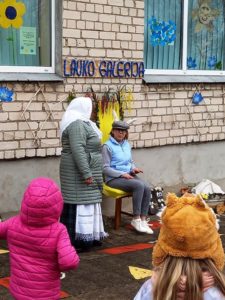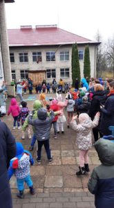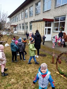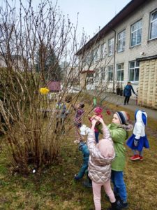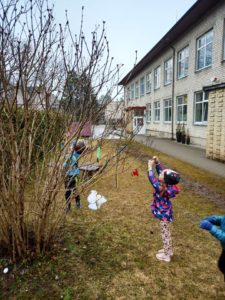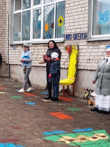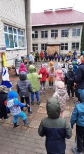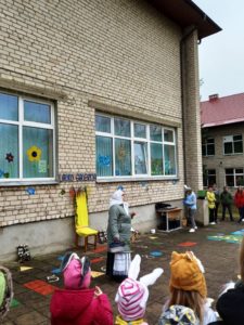Tad kokia staigmena buvo vaikams, kai juos, belaukiančius šventės, aplankė Velykų Bobutė (logopedė Liudvika Razgevičienė) su Kiškučiu (muzikos mokytoja Vaida Kalamažnikienė)! Visi susibūrė mokyklos kieme į rytmetį “Nebedaug jau lyg Velykų”.