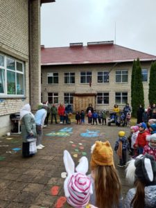 Džiugiai nusiteikę šventinio rytmečio dalyviai skirstėsi į grupes ir klases su Kiškučio dovanotais obuoliukais.