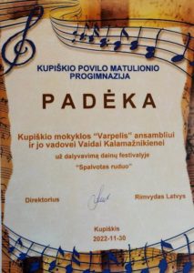 Lapkričio 30 d. mokyklos vaikų ansambliukas „Voversėlis“ dalyvavo rajono respublikiniame dainų festivalyje „Spalvotas ruduo” Kupiškio Povilo Matulionio progimnazijoje. Vaikučiai atliko dvi daineles: „Lyja lyja lietūs“ (muz. ir eilės Elenos Tolvaišienės) ir „Žibinto švieselė“ (ž. Daivos Bauerienės, muz. Gintarės Bauerytės). Turtintino emocinius, estetinius bei dorovinius jausmus, stebėdami kitų rajono mokyklų pasirodymus.