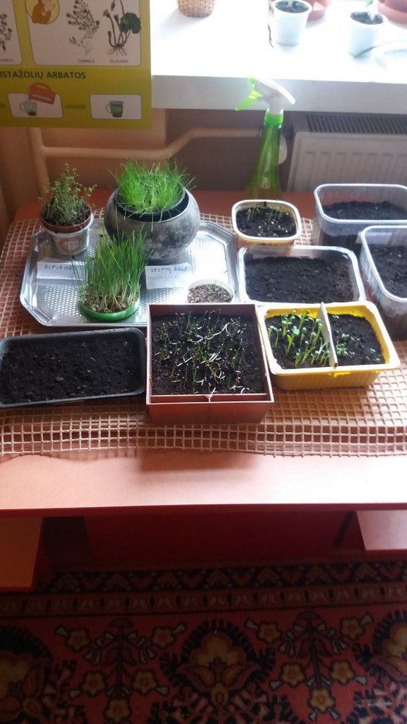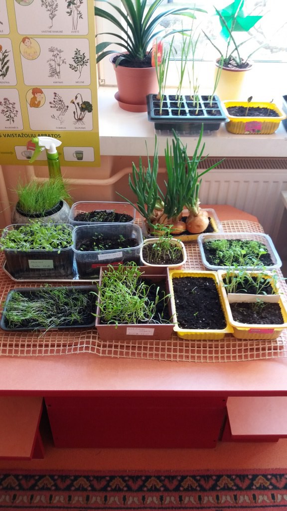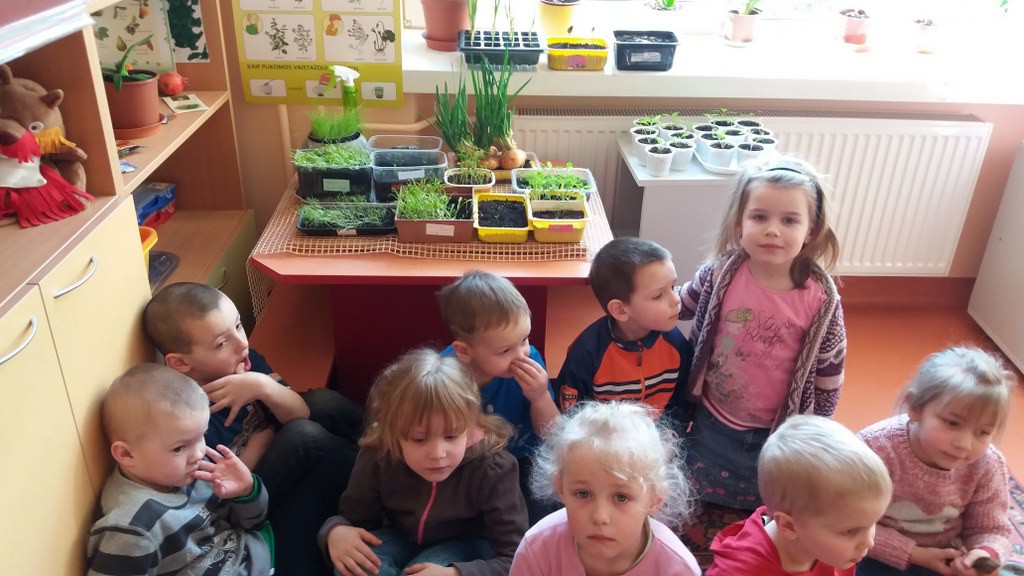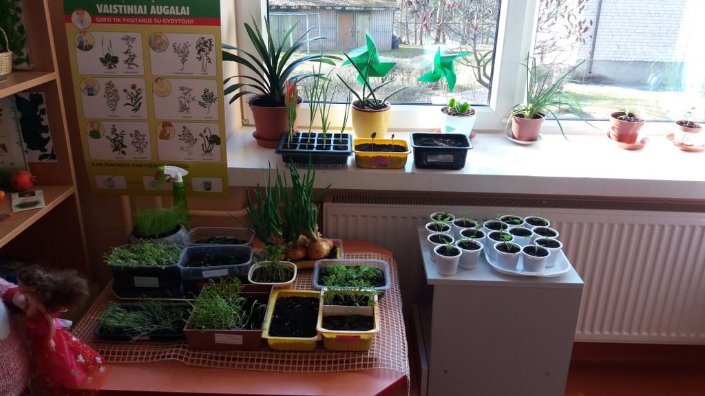Visą kovo mėnesį ,,Vaivoriukų” grupės vaikučiai kartu su auklėtoja Daiva ir auklėtojos padėjėja Regina darbavosi grupės patalpose įkurtoje žaliojoje erdvėje.Žemių ir įvairių sėklų vaikučiams parūpino UAB ,,Durpeta” ir tėveliai.Vaikučiai mokėsi suberti žemes į indelius, pasėti, palaistyti, pamerkė beržo, vyšnios, ievos šakelių. Nuostabu buvo stebėti besprogstančias beržo šakeles ir pražystančius ievos ar vyšnios žiedelius arba ragauti paaugusius svogūnų laiškus. Žalioji palangė tai puiki priemonė tobulinant vaikų pažinimo kompetenciją.